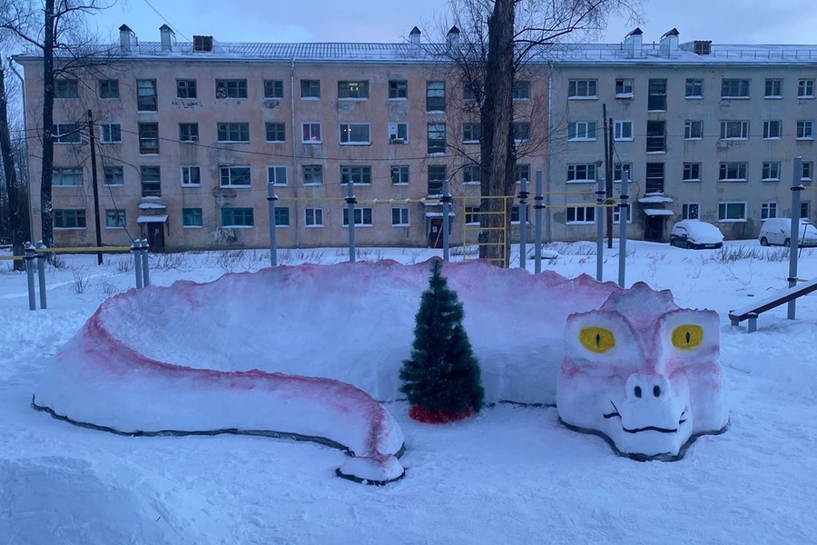 - На этот раз соорудила дракона. За зиму выпало столько снега, что с легкостью вырезала из смерзшихся кусков символ 2024 года. Раскрасить его было легко: взяла спрей, он продается в баллончиках, и обозначила глаза, туловище, хвост, - рассказывает Елена Гриненко. - Раньше лепила тигров и собак. Помогли в работе фантазия и дворник Евгений Клименок, он собрал строительный материал для дракона - сгребал в кучу снег, а я за два часа управилась с новогодней композицией. Всех с наступающим Новым годом!