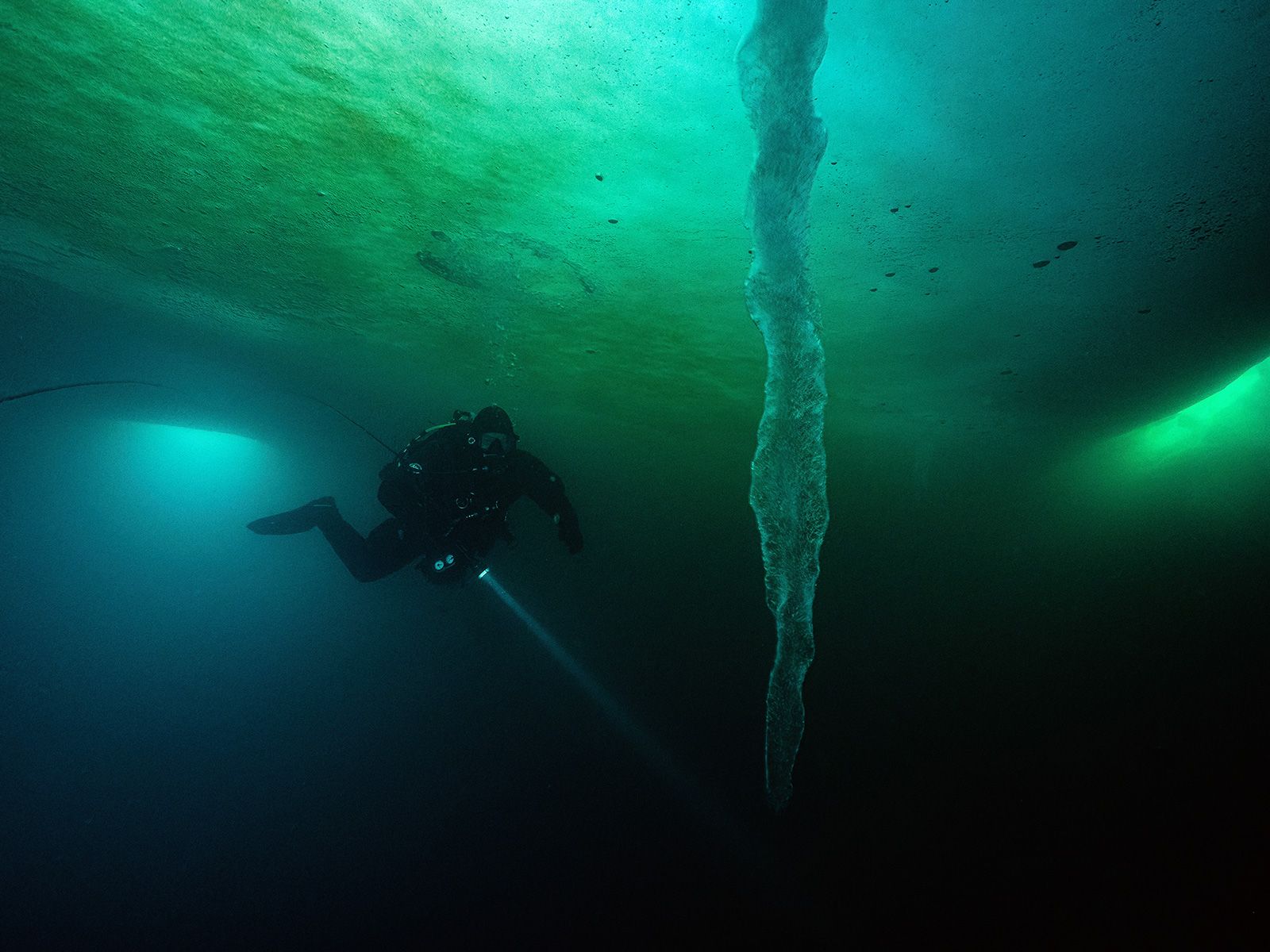 Одна удивительная фотография приехала в Москву из Магадана. Сергей Шанин запечатлел так называемые ледяные пальцы смерти – брайниклы – похожие на подводные сталактиты. Они образовываются при столкновении потока ледяной воды с очень соленой. Долгое время считалось, что такой «сталактит» можно увидеть только на Северном полюсе или в Антарктиде. Однако в 1986 году стало понятно, что они появляются и в Охотском море недалеко от Магадана. «Палец» очень опасен для морской живности: например, звезды или ежи иногда просто не успевают уйти с дороги потока, когда он достигает дна и замораживает воду.