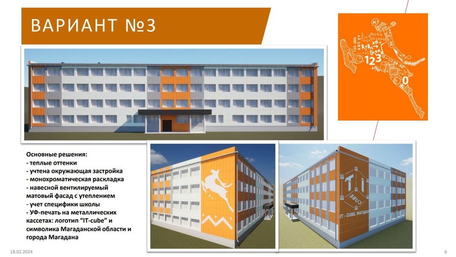 ООО «Идефикс» подготовило несколько вариантов цветового решения здания. При разработке эскизов опирались на окружающую застройку, климатические и отдельные функциональные особенности здания. Так, для фасада будут использованы решения, созвучные названию школы – ее украсят математические элементы.